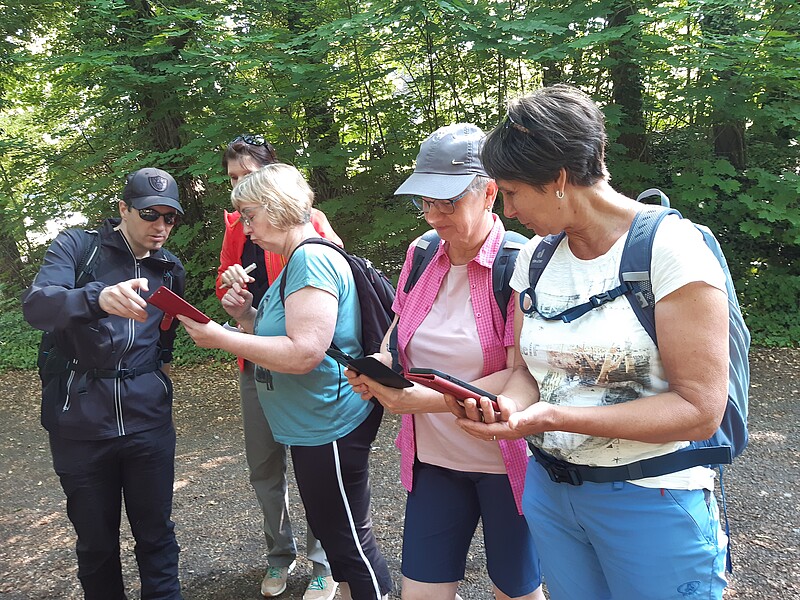 Am Freitagmorgen wurde das Geocaching erklärt und der Umgang App und GPS-Geräten geübt. Auf einem vorgegebenen Kurs musste dann an jedem Zwischenziel ein Geocache gefunden werden. Wir Teilnehmenden waren verwundert mit wieviel Mühe zum Detail die Caches hergestellt waren. Der Wunsch nach mehr wurde bei allen geweckt.