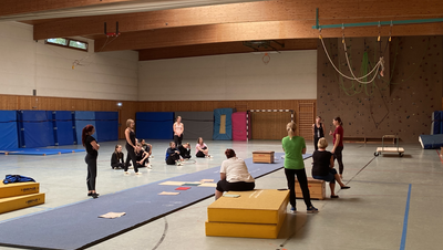 Knapp 20 Teilnehmerinnen lernen beim RegioTÜF "Grundlagen Gerätturnen" Handstand, Rolle und Co.