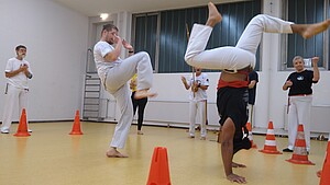 Orange-weiße Leitkegel auf dem Boden, der Geruch von Desinfektionsmittel liegt in der Luft. Zur Begrüßung gibt’s den Ellbogen-Check, den Toiletten-Gang nur mit Mund-Nasen-Bedeckung. Und das wichtigste: Immer schön Abstand halten. Zugegeben - auf den ersten Blick wirkte dieses Bild etwas ungewohnt. Doch spätestens als der erste surrend-scheppernde Ton auf dem Berimbau angeschlagen wurde, war dieser Eindruck verflogen und wich der vertrauten Capoeira-Energie.