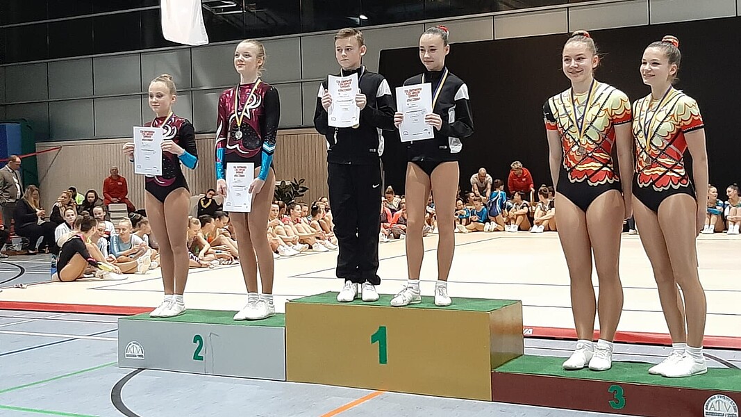 Danach sollten Leni Kirschenmann und Kira Dittler ihre neue Choreografie im Duo 9 – 11 Jahre vorstellen. Doch leider verletzte sich Leni kurz vor dem Wettkampf und so konnte das Duo nicht starten. Kira Dittler präsentierte ihre Einzelübung AK 9 – 11 Jahre in einem stark besetzten internationalen Starterfeld von über 40 Gegnern und erturnte sich Platz 28. Leoni Patyk errang in der gleichen Altersklasse einen sehr guten 12. Platz. Leoni wird von Jessica und Christine Kieweg trainiert. Das Trio der AK 9 – 11 mit Melanie Auer, Leonie Patyk und Marlene Othmer musste sich aufgrund eines Patzers in der noch neuen Übung mit Platz 8 zufrieden geben.