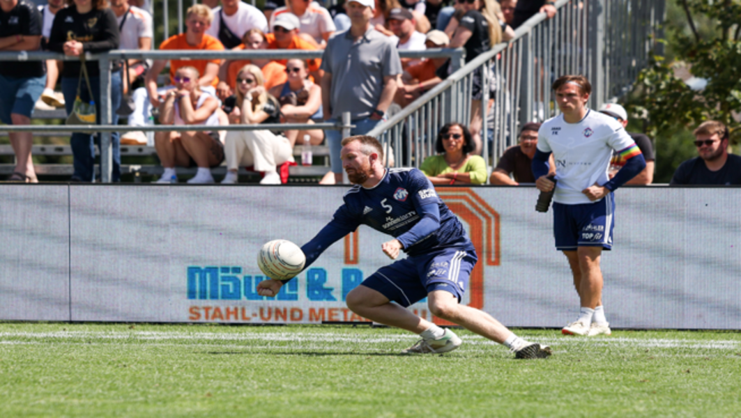 Player of the Match wurde Nick Trinemeier, der übrigens mit den etwas zu großen Stollenschuhen seines Käfertaler Teamkameraden und Stadionmoderators Christian Gillmann spielte, weil seine eigenen Schlappen vor Spielbeginn den Geist aufgegeben habe. „Ich habe sie mit meinen Einlagen ganz eng geschnürt, so ging es“, verriet Trinemeier. Bild 3