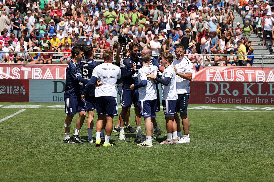 Was für ein Spektakel! Die Sonne strahlte über der Arena und die Sportler boten ein knallhartes Duell mit allem, was Männer-Faustball aufbieten kann. Im zweiten „kleinen Finale“ des Tages standen sich erneut Südvereine gegenüber. Die Vaihinger, mit Johannes Jungclaussen und Jakob Kilpper im Angriff, Jaro (Mitte) und Jacob Jungclaussen sowie Tobias Maurer, kamen zunächst nicht mit den gut gestaffelten Käfertalern mit. Satz 1 ging deutlich an die Kurpfälzer, die mit der starken Aufstellung des Vortages gleich im Spiel waren. Bild 6