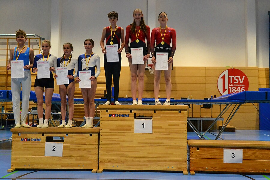 In der offenen Klasse der Vereinsmannschaften entbrannte wie in den vergangenen Jahren der übliche Titelkampf zwischen dem TSV Mannheim und dem TV Ichenheim. Die jungen Erwachsenen, fast allesamt auch als Trainer in ihren Vereinen aktiv, gingen dem Nachwuchs mit gutem Beispiel voran und zeigten großen Teamgeist sowie vorbildliche Fairness. Am Ende siegte der TV Ichenheim auch hier dank einer ausgewogenen Teamleistung und durch die Tageshöchstnote von 47,77 Punkten, die Indira Häußermann erturnte. Silber ging nach Mannheim, Bronze an den TV Nöttingen.
